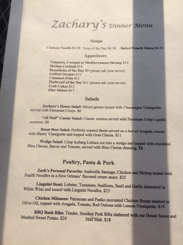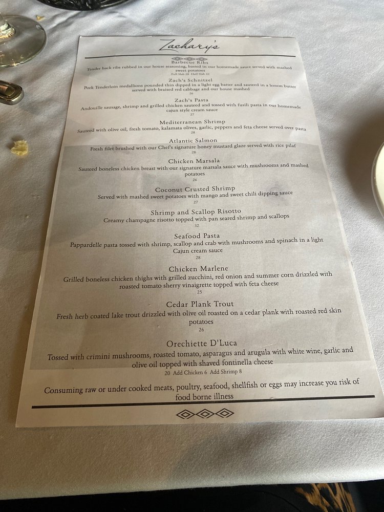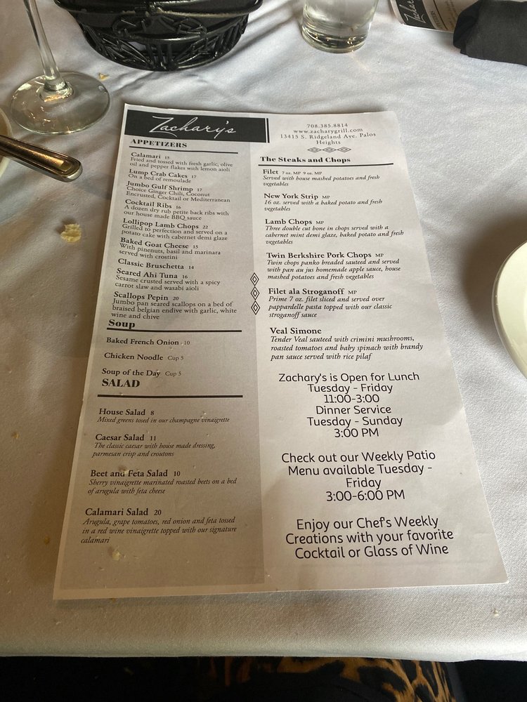 Welcome to Zachary's Grill, a remarkable dining spot nestled in Palos Heights, Illinois, where the taste of savory steak and fresh seafood come together in a casual, welcoming atmosphere. The menu is a culinary journey, highlighted by standout dishes like the Atlantic Salmon with honey mustard glaze, tender Barbecue Ribs, and mouthwatering Filet Mignon. For lighter fare, try the classic Caesar Salad or the flavor-packed Chicken Milanese.